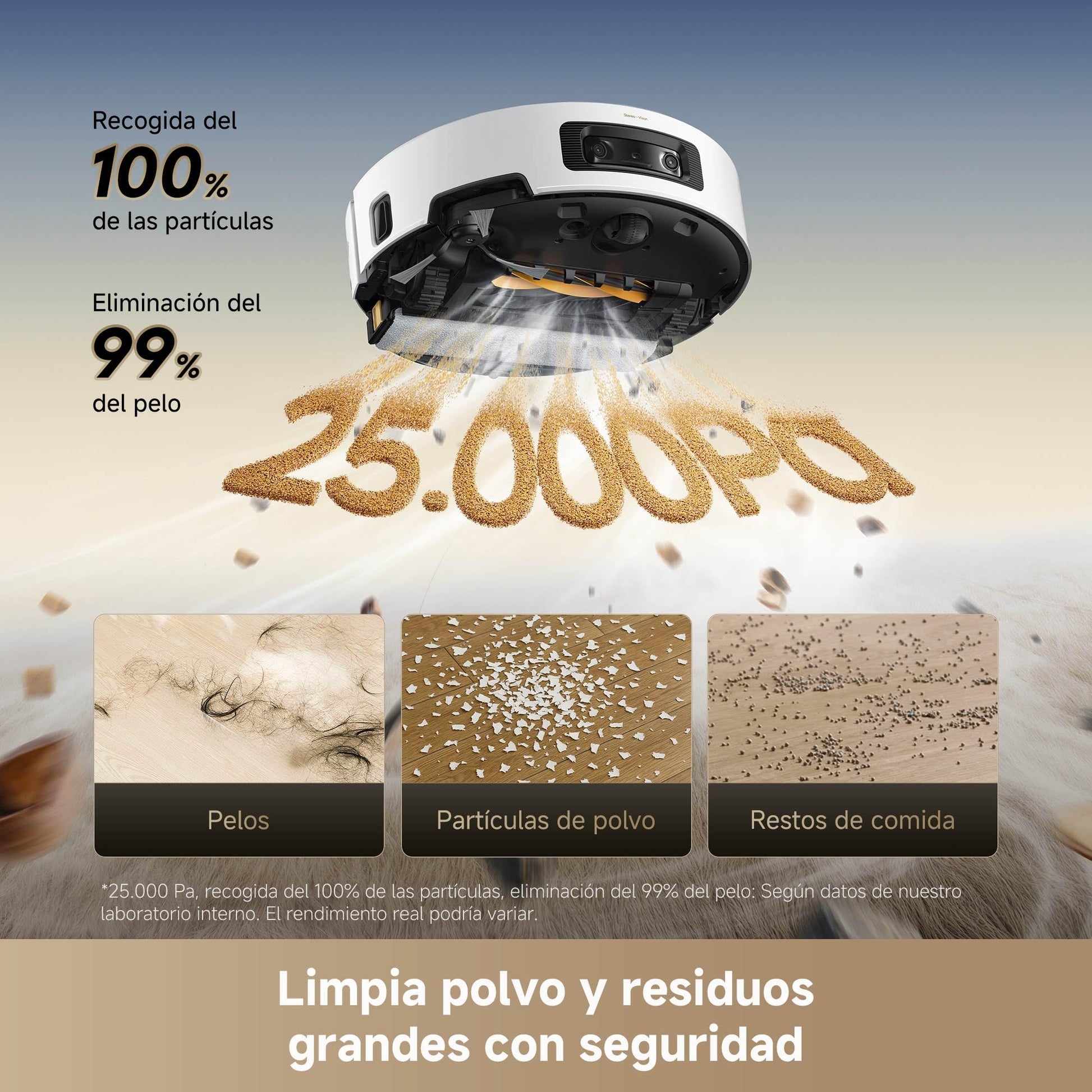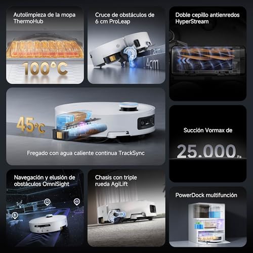 - La Succión de 25.000 Pa Captura Residuos Sin que Se Enreden los Pelos: La succión Vormax de 25.000 Pa ofrece una potente recogida de residuos mientras minimiza el nivel de ruido para hacer más cómoda la experiencia de limpieza. Nuestro nuevo doble cepillo antienredos HyperStream ofrece un rendimiento 100% desenredante con un cepillo de goma con cerdas y un cepillo de goma TPU.