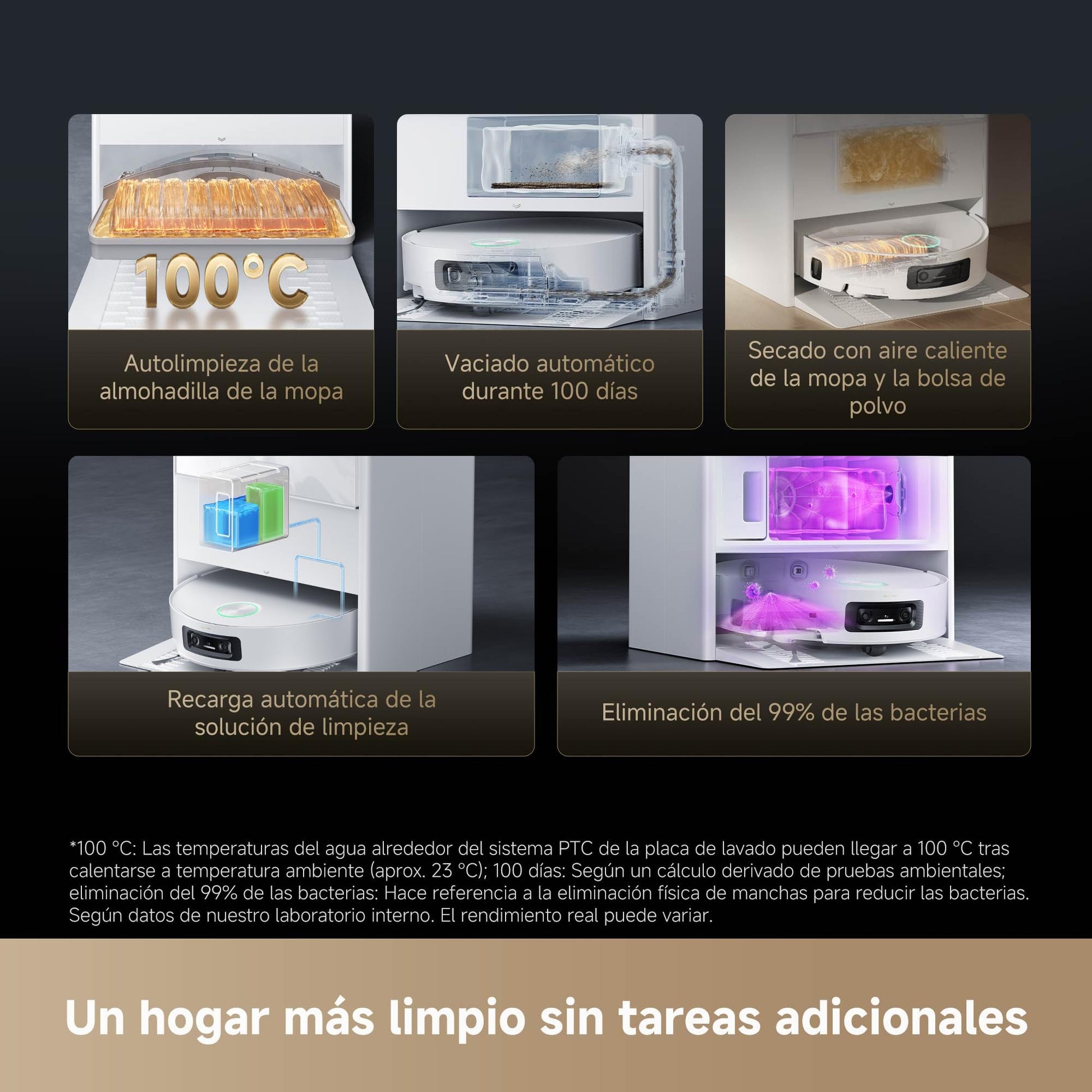 - Práctico PowerDock Todo En Uno: Con Aqua10 Ultra Track Complete, no tienes que vaciar a mano el compartimento de polvo durante hasta 100 días, y también lava las almohadillas de las mopas con agua caliente a 100 °C y las seca. Además, recarga la solución de limpieza y el agua para fregar, y lava la placa hasta dejarla casi sin residuos, para que la experiencia poslimpieza sea realmente manos libres.