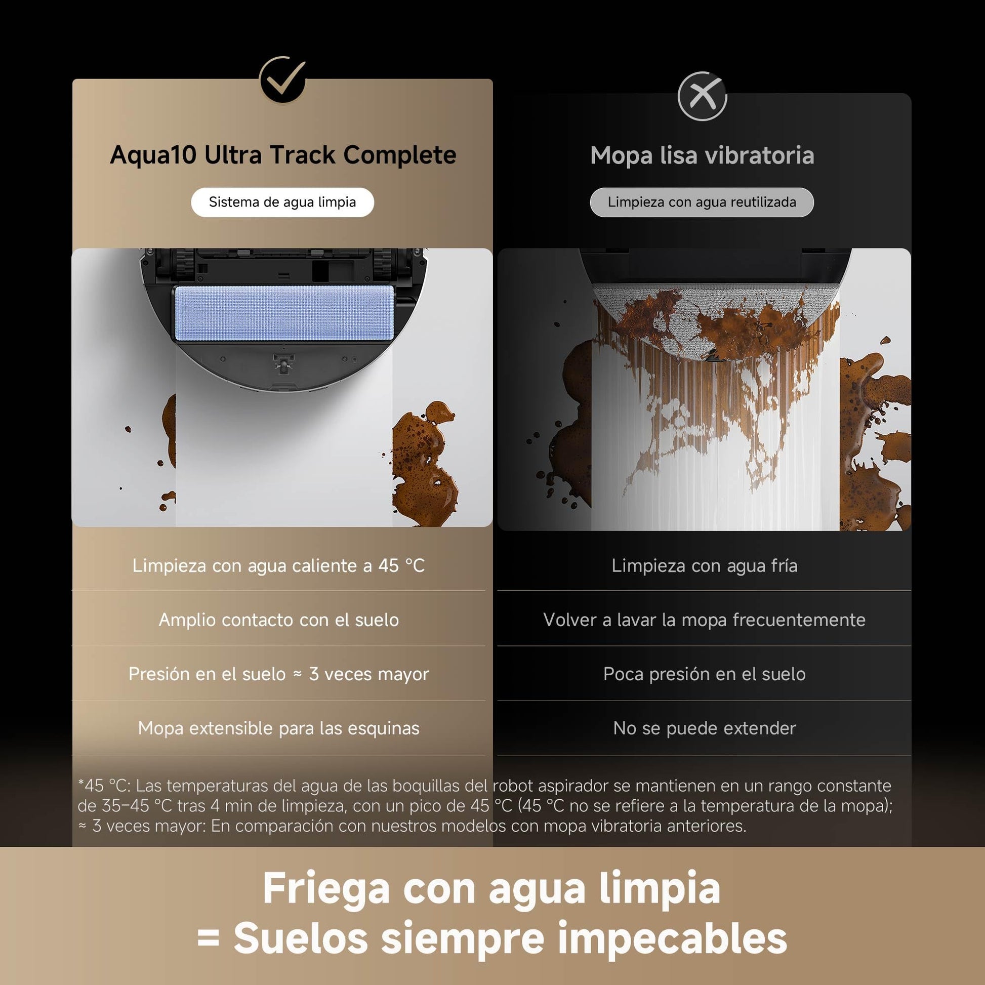 - La Innovadora Mopa a Tracción Permite Limpiar con Agua Limpia: Al pulverizar continuamente agua limpia caliente en la mopa a tracción giratoria y recoger el agua usada, este robot aspirador garantiza que tus suelos siempre se limpien con agua limpia, para no tener que volver a lavar la mopa innecesariamente.