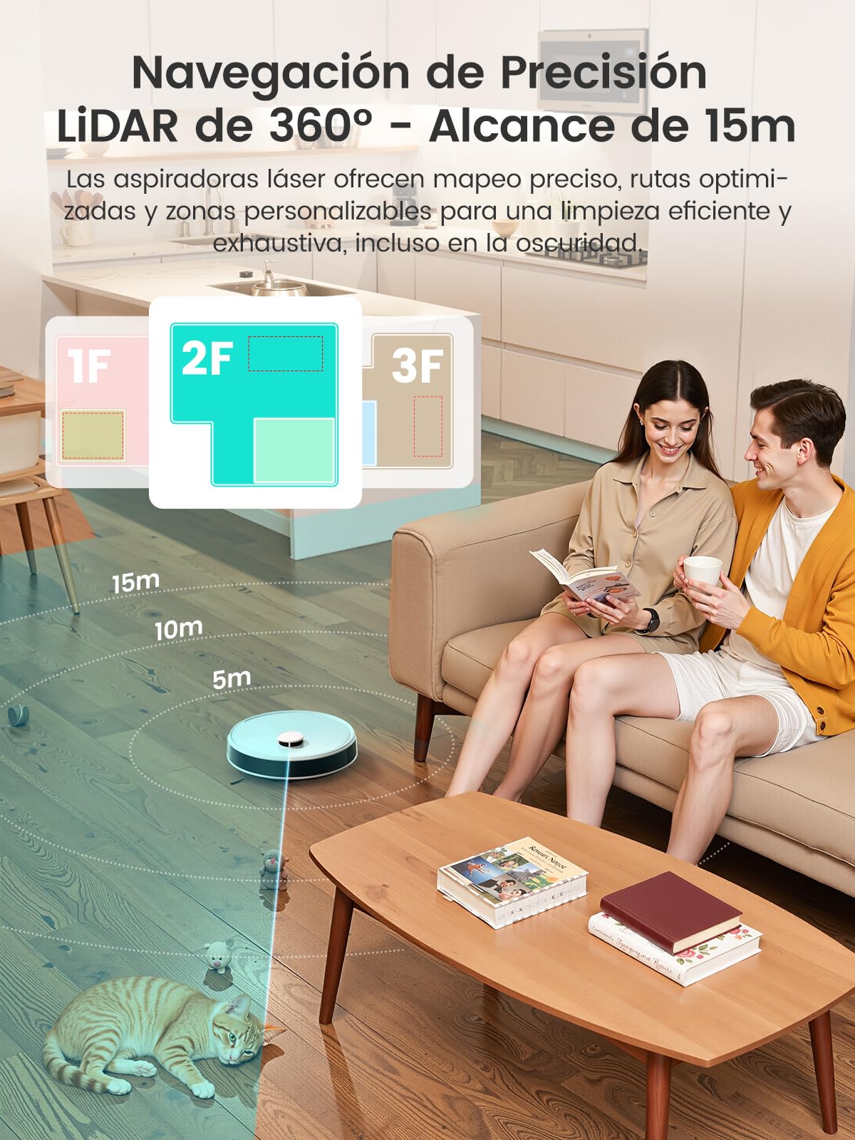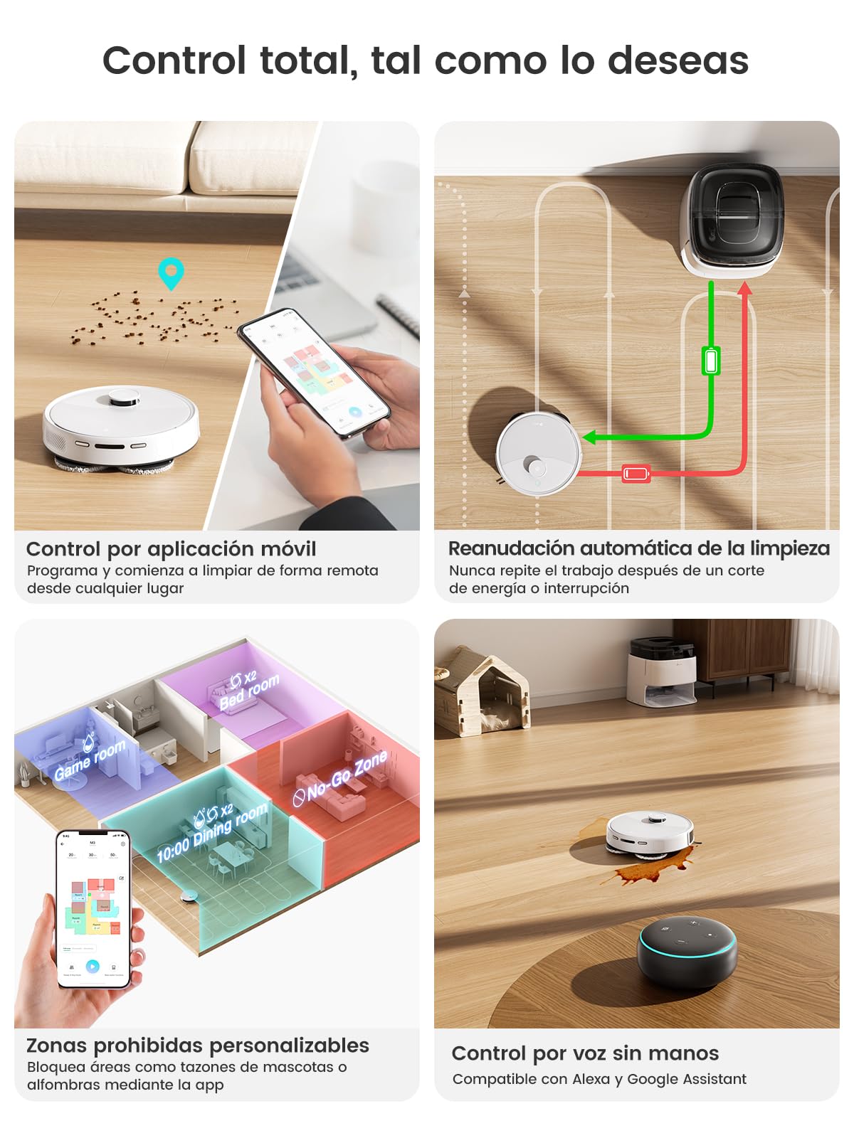 - 【Cartografía inteligente】Reconoce múltiples niveles, planifica rutas sin redundancias e incluye triple seguridad: anti-caídas, anti-colisiones y anti-atascos.