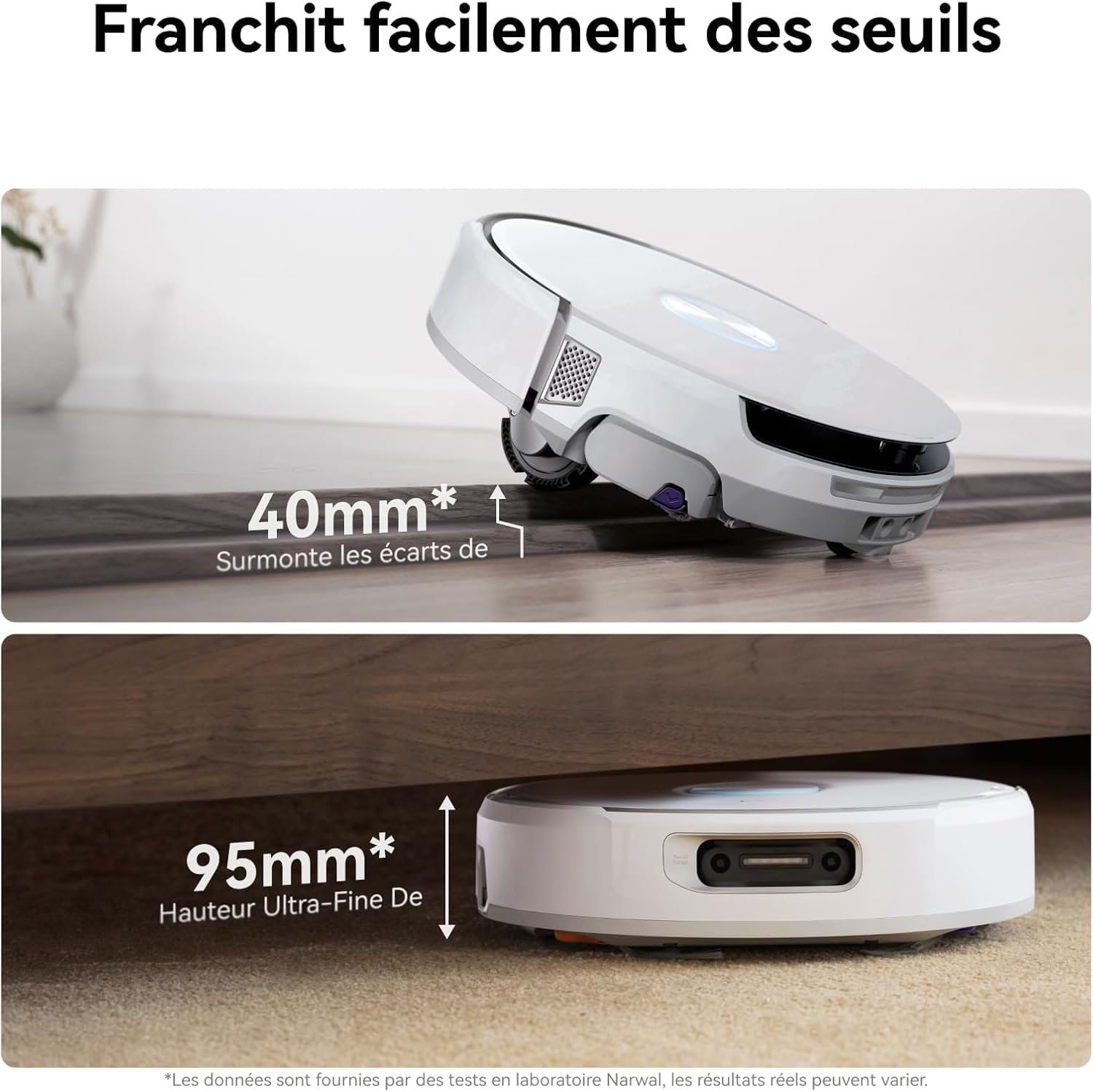 - Ultra Delgado: Con solo 95 mm de altura, llega fácilmente bajo muebles y camas. Supera automáticamente obstáculos de hasta 40 mm (desniveles, umbrales) sin necesidad de levantarlo.