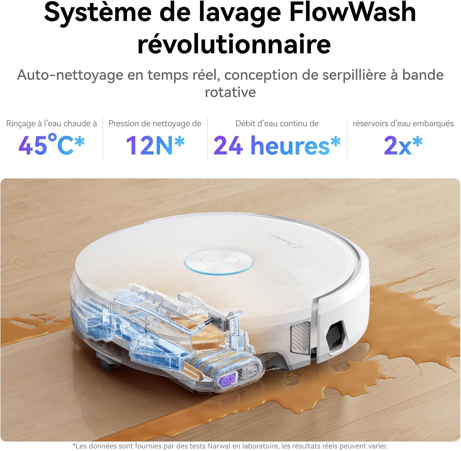 NARWAL Flow Robot Aspirador y Fregasuelos Todo en Uno, Sistema FlowWash de Autolimpieza, 22.000Pa de Succión, Tecnología Anti-Enredos para Pelo de Mascotas, Lavado con Agua Caliente 45-80°C