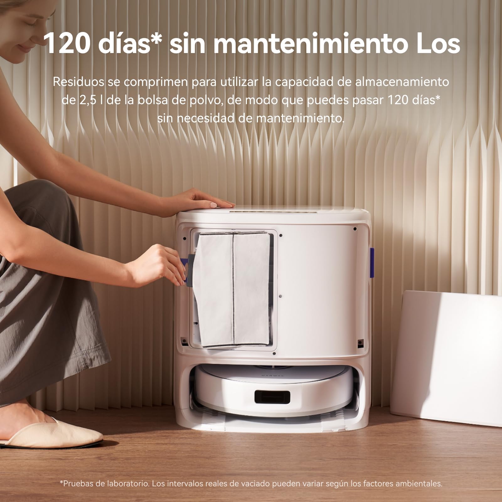 - [ Base Todo-en-Uno Inteligente ] La base todo-en-uno garantiza mantenimiento completamente manos libres. Incluye autovaciamiento (bolsa 2.5L, autonomía 120 días), lavado con agua calda (40-45°C), secado bidireccional y esterilización a 77°C. Disfrute de suelos perfectos sin esfuerzo.