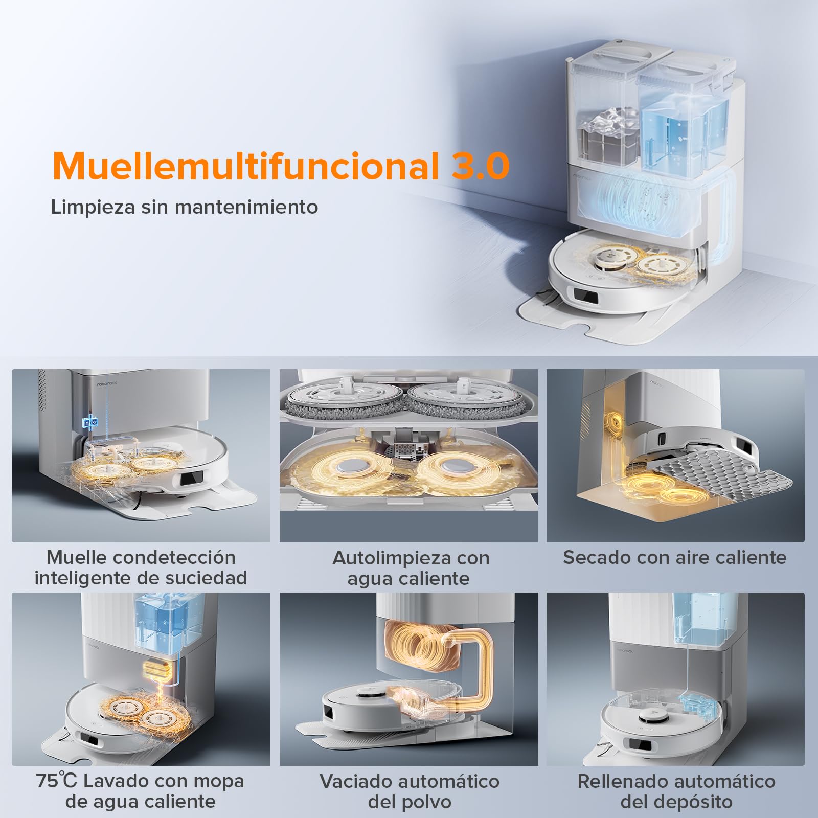 - Experiencia Master-Class sin mantenimiento: Muelle multifunción 3.0 todo en uno con agua caliente. Hasta 75℃, el lavado con mopa de agua caliente y la autolimpieza llevan la limpieza al siguiente nivel, eliminando fácilmente las manchas difíciles y manteniendo un entorno doméstico impecable. Una bolsa recogepolvo de hasta 4L soporta más de 60 días de limpieza sin problemas.