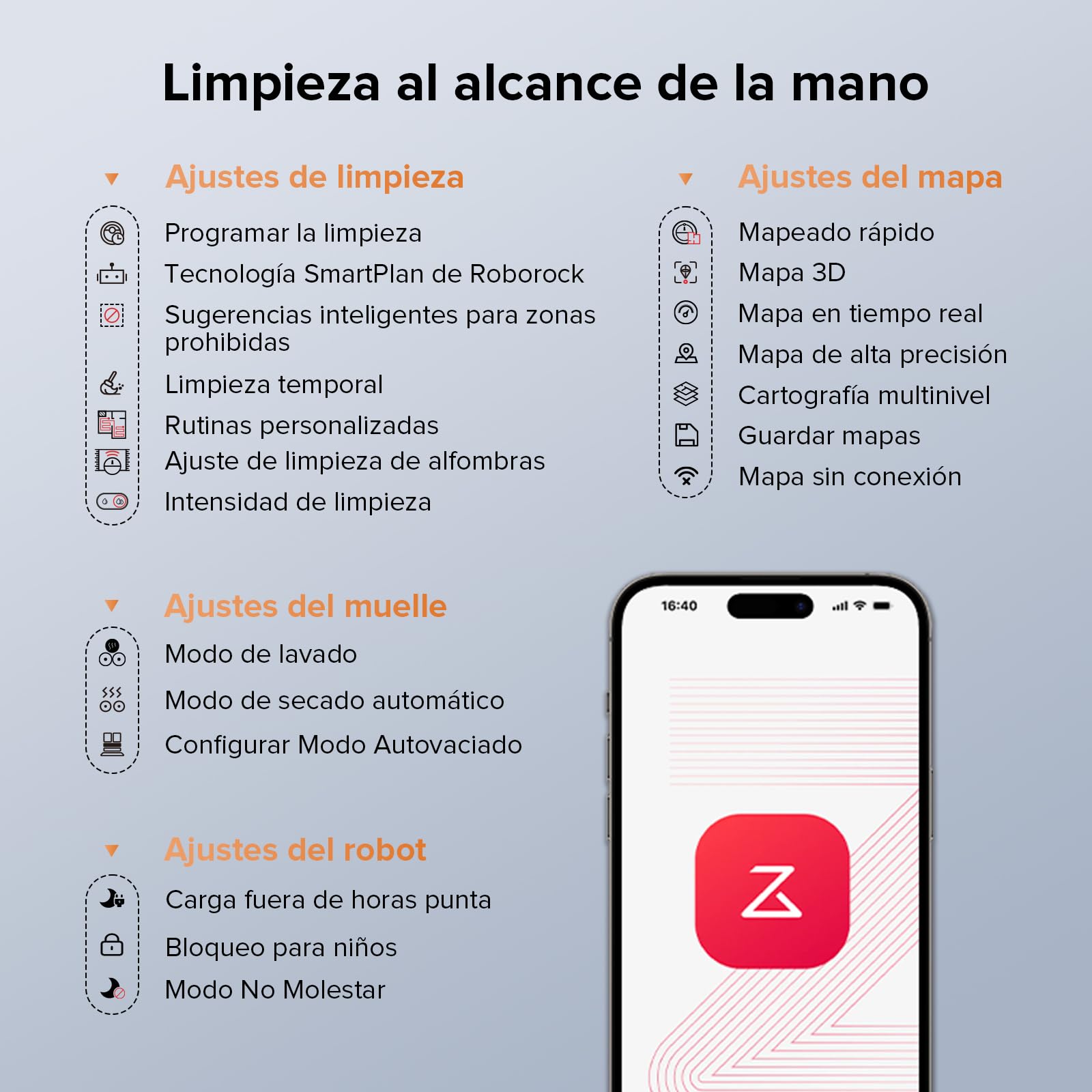 - Control al alcance de la mano: Gestione todo con la aplicación Roborock actualizada. Los algoritmos avanzados de IA garantizan una limpieza más inteligente y sin estrés. La aplicación permite gestionar fácilmente diversas funciones, como rutinas, detalles de mapas, temperaturas de lavado, duración del secado y condiciones de mantenimiento.