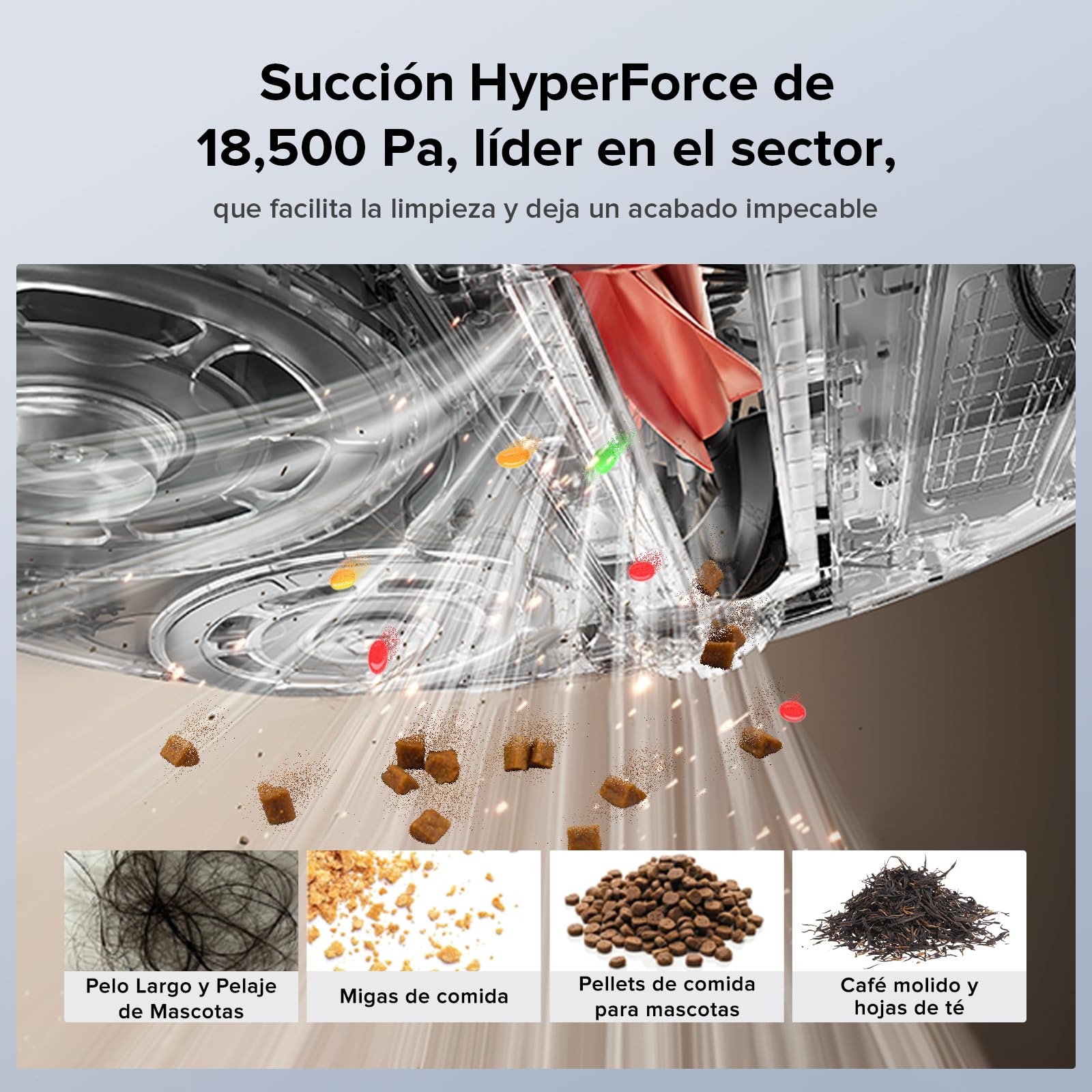 - Potencia de limpieza inigualable: Disfrute de la succión HyperForce de 18.500 Pa líder del sector. Con una potente succión de hasta 18,500 Pa, supera fácilmente todos los retos de limpieza, levantando con fuerza el pelo, los restos, el polvo y la suciedad de alfombras y suelos duros hasta el cubo de la basura.