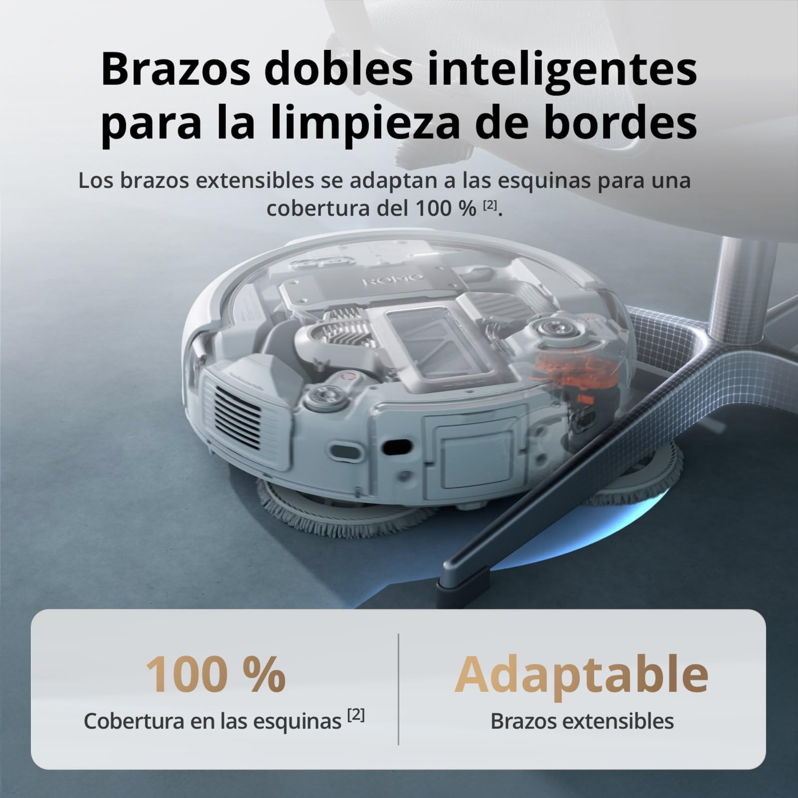 - Brazos robóticos dobles: guiados por algoritmos adaptativos, los brazos dobles extensibles se retraen y se extienden para adaptarse a cualquier espacio, llegando a los rincones más profundos y a lo largo de los bordes para una limpieza a fondo.