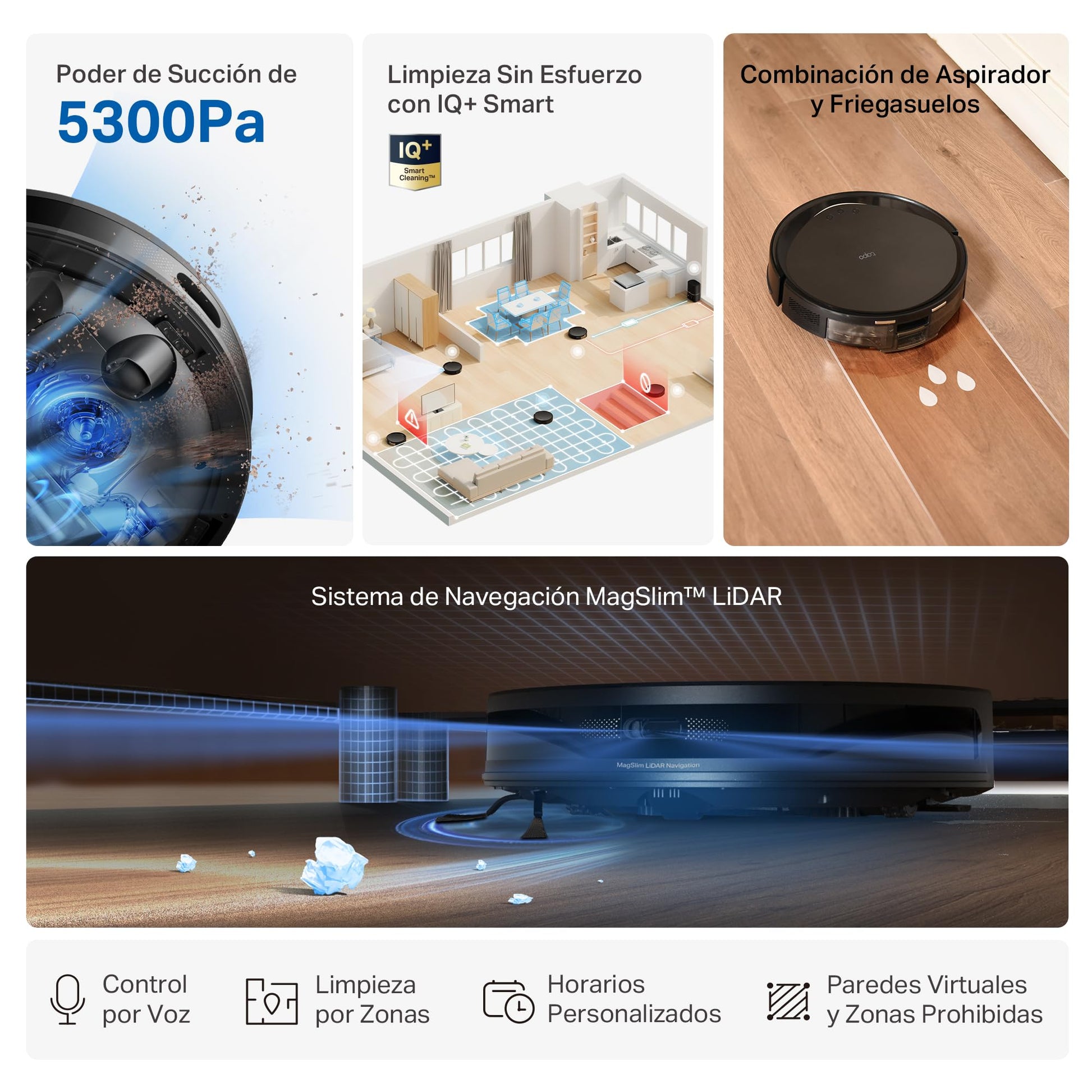 - Funciones inteligentes: tapo IQ+ Smart Cleaning para una automatización confiable, horarios de limpieza personalizables y almacenamiento de mapas de múltiples pisos